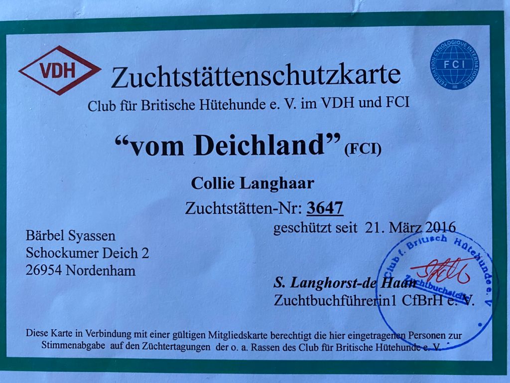 Im Sommer 2015 zog unsere Fresena’s Dolce Vita ( Darla) bei uns ein. Im März 2016 wurde unser Zwinger Langhaar Collies vom Deichland international in der FCI geschützt. Unsere Zuchtstätte wurde nach der Prüfung durch den Zuchtwart freigegeben.Wir sind Züchter im CfbrH/ VDH/FCI.Neben regelmäßigen Weiterbildungen gehören gemeinsame Unternehmungen und Austellungen zu unserem Programm. Im Winter 2018 war es dann nach langen Vorbereitungen und einigen Rückschlägen endlich soweit . Unser A Wurf kam zur Welt . Wir danken Familie Hild für zwei wunderbare Collies , das sie uns mit gutem Rat aber auch Kritik geholfen hat und insbesondere meinem